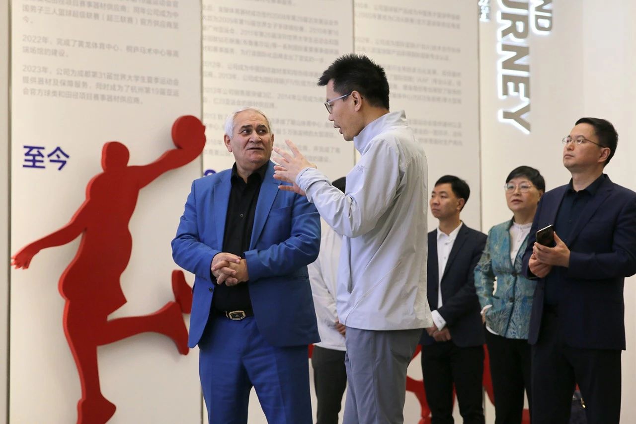 穆哈邁德·扎路主席一行在國家體育總局舉摔柔中心主任劉成亮、蘇州市體育局副局長程軍紅、張家港市文體廣旅局局長周穎和金陵體育總經(jīng)理李劍剛的陪同下,參觀了公司數(shù)字化展廳、產(chǎn)品展示館、智能化制造車間、檢測中心和金陵洲際文體,詳細了解了金陵體育的發(fā)展歷程、業(yè)務版圖以及智能化球館、籃球租售終端等數(shù)字化、網(wǎng)絡化、智能化技術下的創(chuàng)新模式和落地成果。