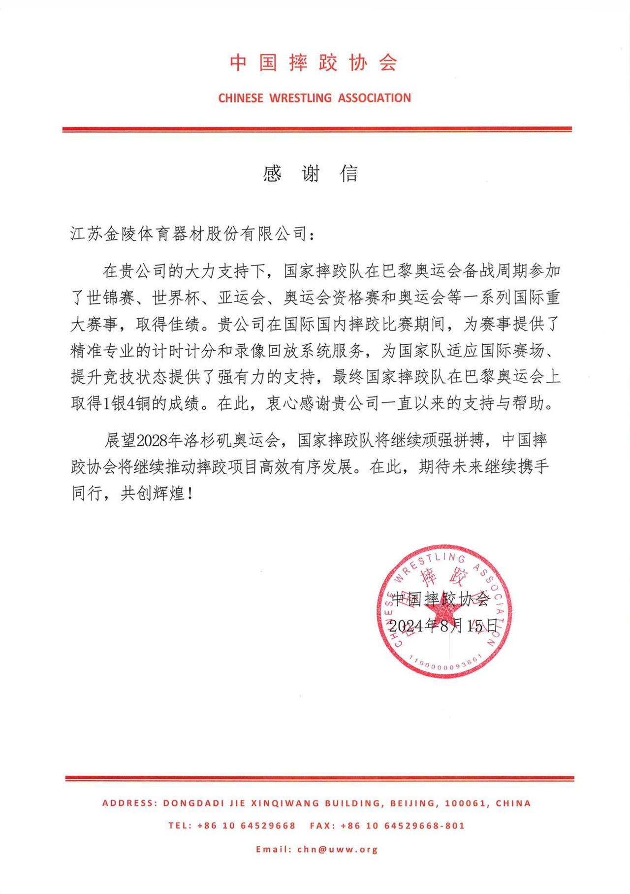 近日,中國(guó)摔跤協(xié)會(huì)向金陵體育發(fā)來(lái)感謝信,感謝金陵體育為中國(guó)國(guó)家摔跤隊(duì)奧運(yùn)爭(zhēng)光做出的貢獻(xiàn)。
